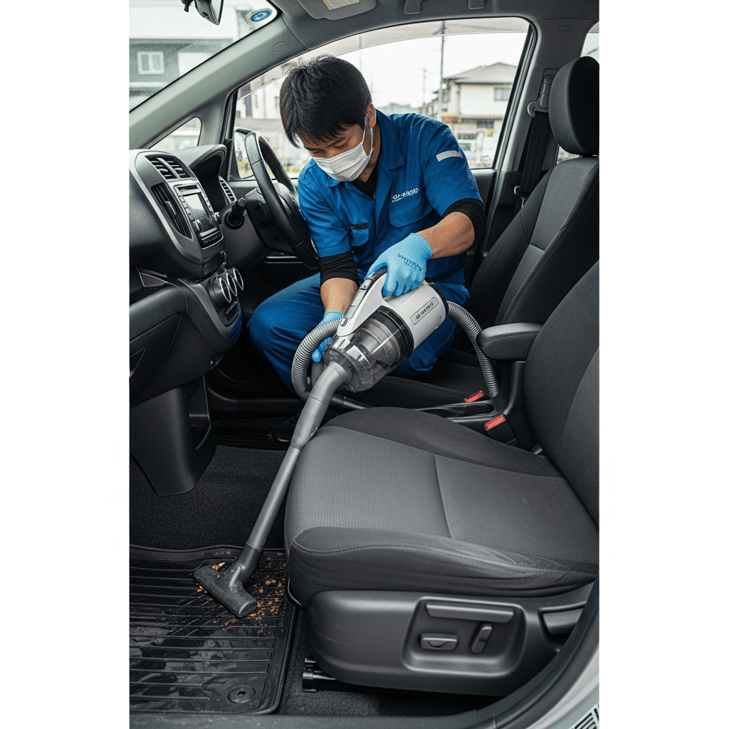 eKスポーツは第一印象が査定の8割を決めます。シート隙間のゴミ除去、マット洗浄、樹脂パーツ艶出しで新車級の清潔感に。特に臭いゼロなら「禁煙車」扱いで+5~8万円UP。