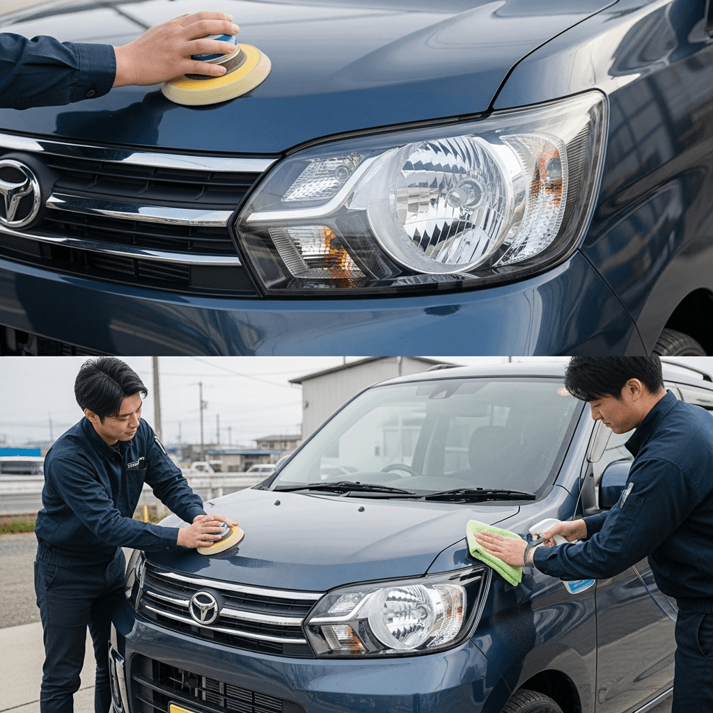 eKスポーツはヘッドライトの黄ばみとボディの鉄粉が第一印象を損ねます。研磨+鉄粉除去クリーナー+ワックスで輝きを取り戻せば「程度良好」と判断され+4~7万円の効果。