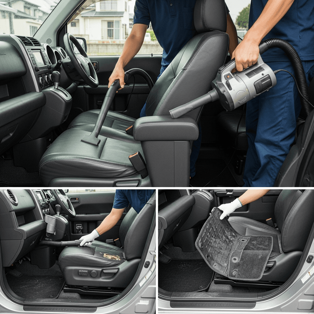 エレメントは第一印象が査定の8割を決めます。シート隙間のゴミ除去、マット洗浄、樹脂パーツ艶出しで新車級の清潔感に。特に臭いゼロなら「禁煙車」扱いで+5~8万円UP。