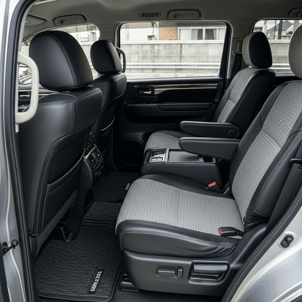 エルグランドは大家族利用が多く、3列目シートの汚れ・シミが査定マイナス要因。専用クリーナーで徹底清掃し、消臭スプレーで臭いゼロにすれば「禁煙・丁寧使用」の印象で+6~9万円UP。