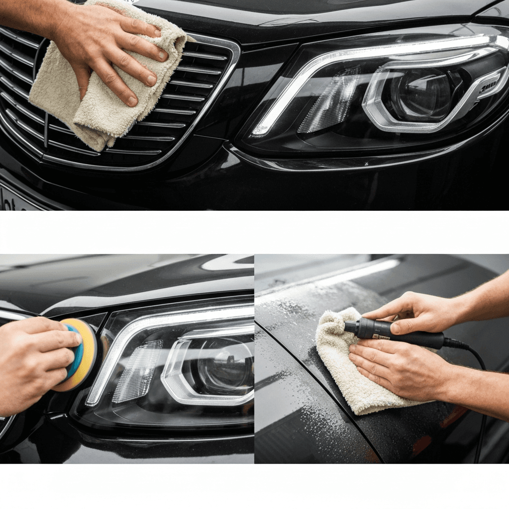 EQCはヘッドライトの黄ばみとボディの鉄粉が第一印象を損ねます。研磨+鉄粉除去クリーナー+ワックスで輝きを取り戻せば「程度良好」と判断され+4~7万円の効果。