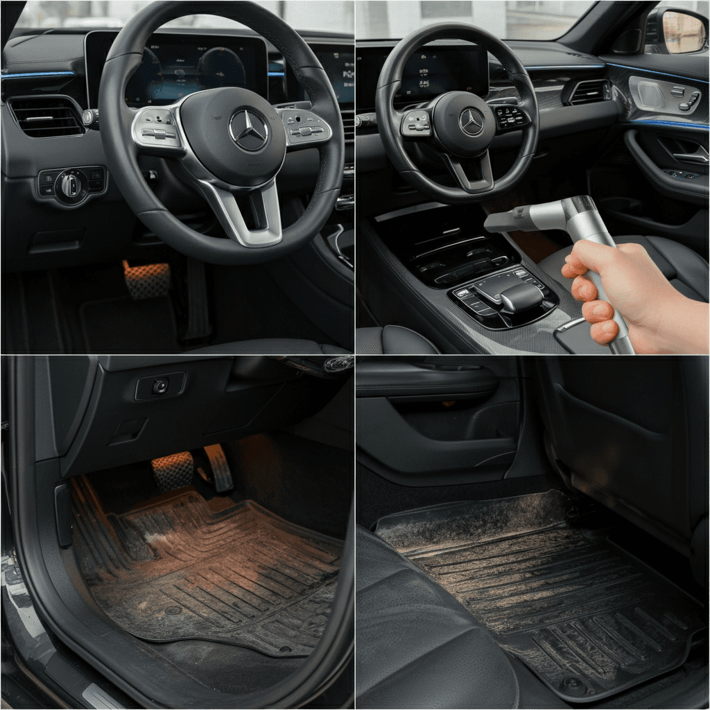 EQCは第一印象が査定の8割を決めます。シート隙間のゴミ除去、マット洗浄、樹脂パーツ艶出しで新車級の清潔感に。特に臭いゼロなら「禁煙車」扱いで+5~8万円UP。