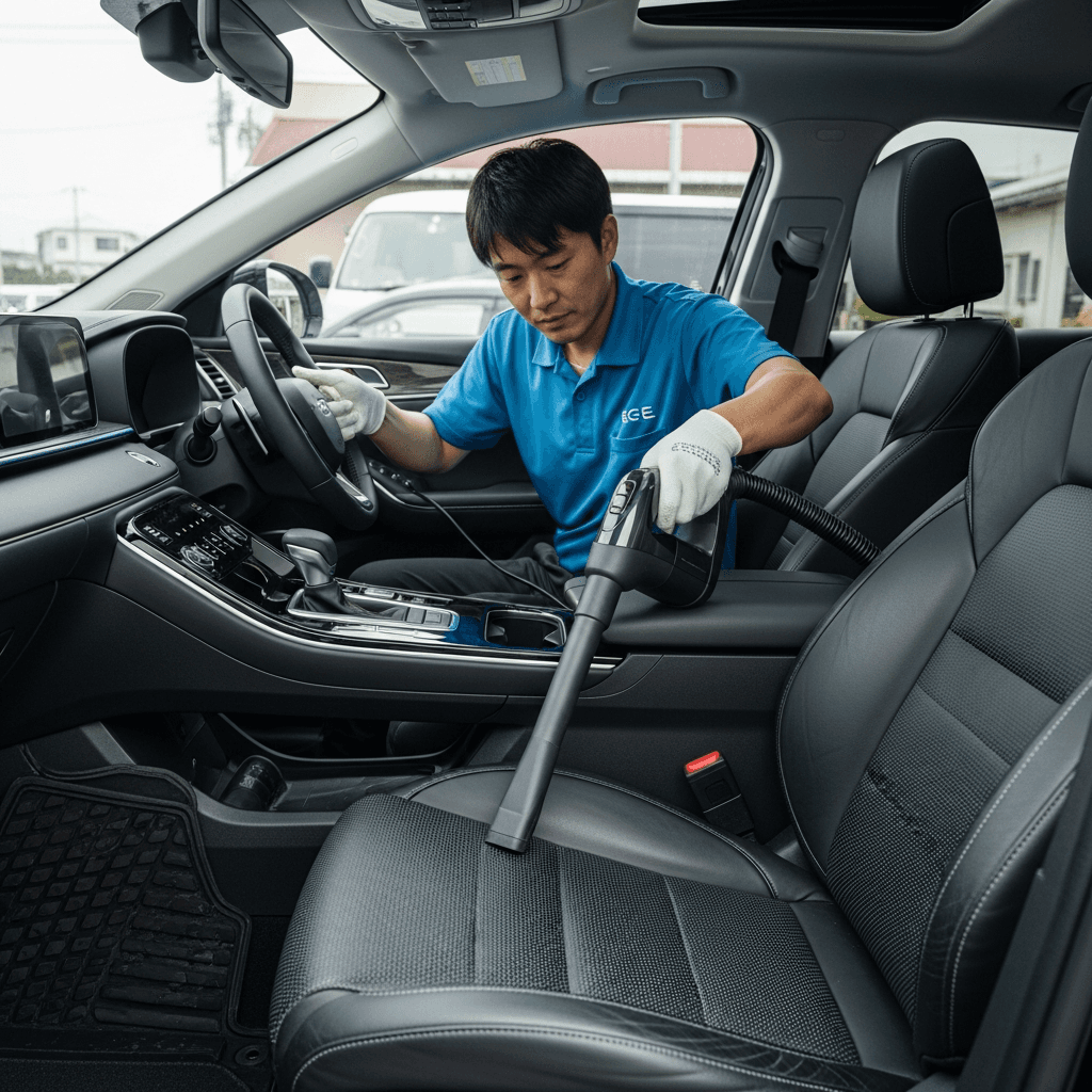 EQE SUVは第一印象が査定の8割を決めます。シート隙間のゴミ除去、マット洗浄、樹脂パーツ艶出しで新車級の清潔感に。特に臭いゼロなら「禁煙車」扱いで+5~8万円UP。