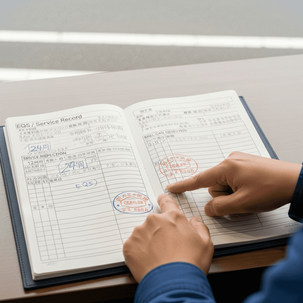 EQSの整備記録簿に定期点検(12ヶ月・24ヶ月)の履歴が全て記載されていれば「管理の行き届いた車」と高評価。特にエンジンオイル交換履歴は重要で+6~9万円の効果。