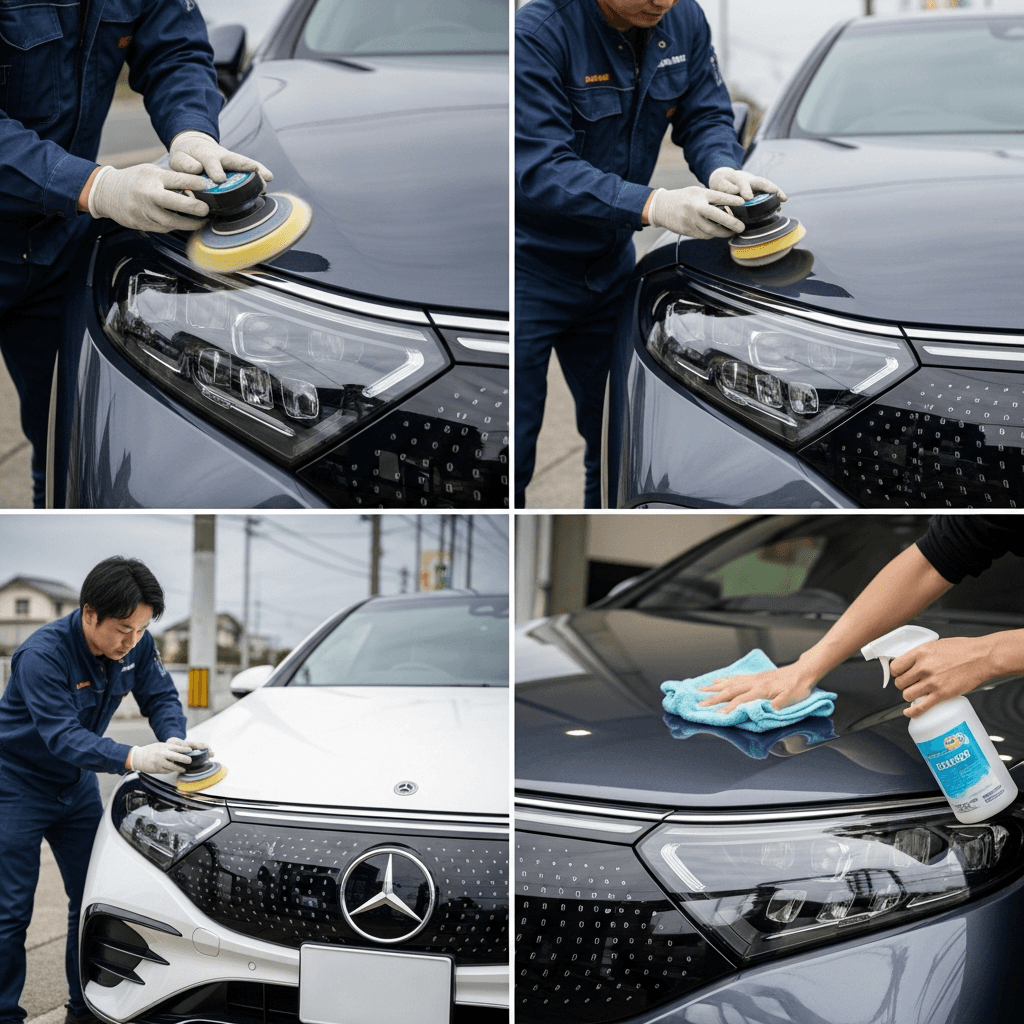 EQSはヘッドライトの黄ばみとボディの鉄粉が第一印象を損ねます。研磨+鉄粉除去クリーナー+ワックスで輝きを取り戻せば「程度良好」と判断され+4~7万円の効果。