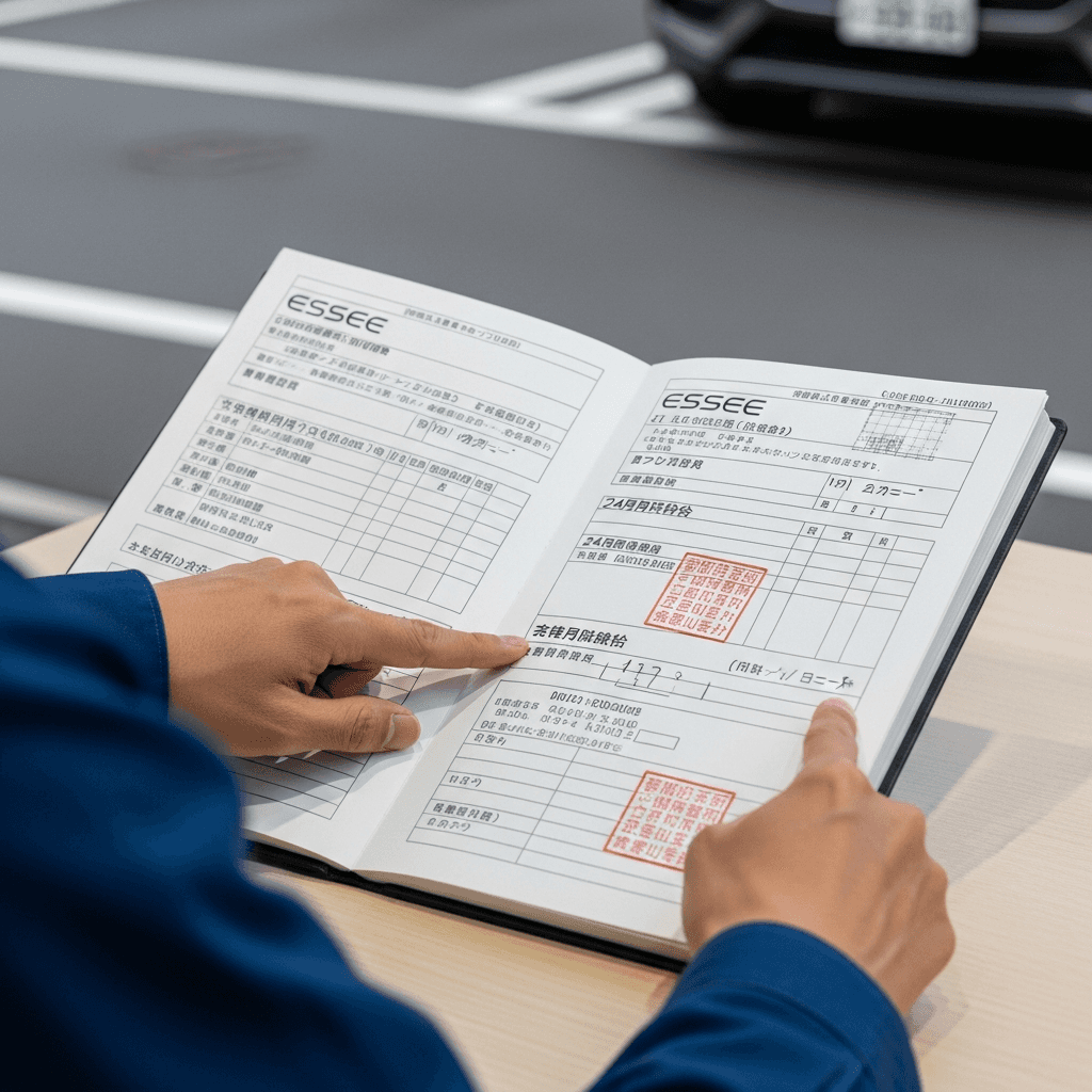 エッセの整備記録簿に定期点検(12ヶ月・24ヶ月)の履歴が全て記載されていれば「管理の行き届いた車」と高評価。特にエンジンオイル交換履歴は重要で+6~9万円の効果。