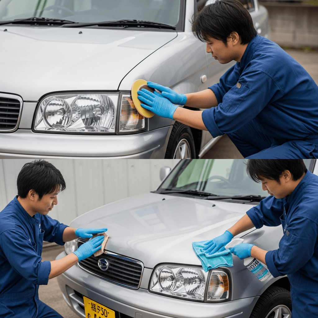 エッセはヘッドライトの黄ばみとボディの鉄粉が第一印象を損ねます。研磨+鉄粉除去クリーナー+ワックスで輝きを取り戻せば「程度良好」と判断され+4~7万円の効果。