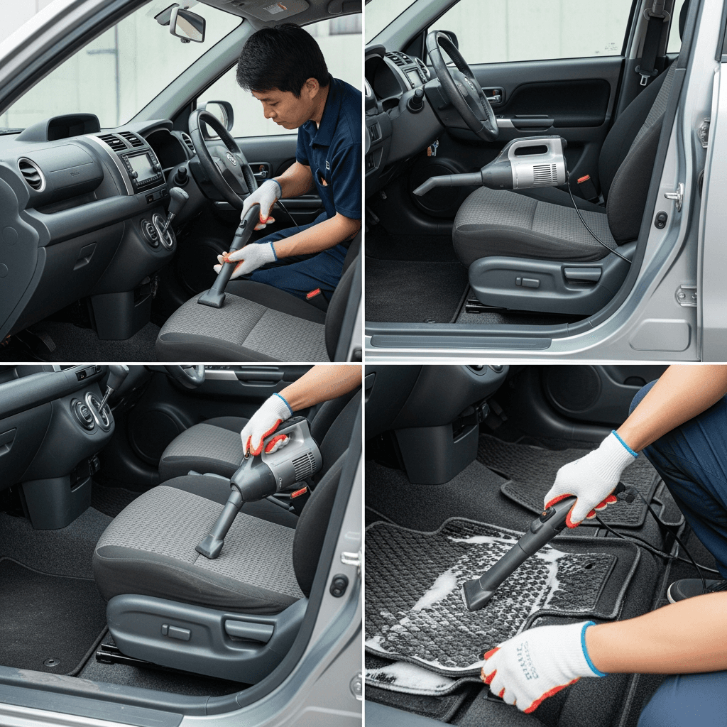 エッセは第一印象が査定の8割を決めます。シート隙間のゴミ除去、マット洗浄、樹脂パーツ艶出しで新車級の清潔感に。特に臭いゼロなら「禁煙車」扱いで+5~8万円UP。