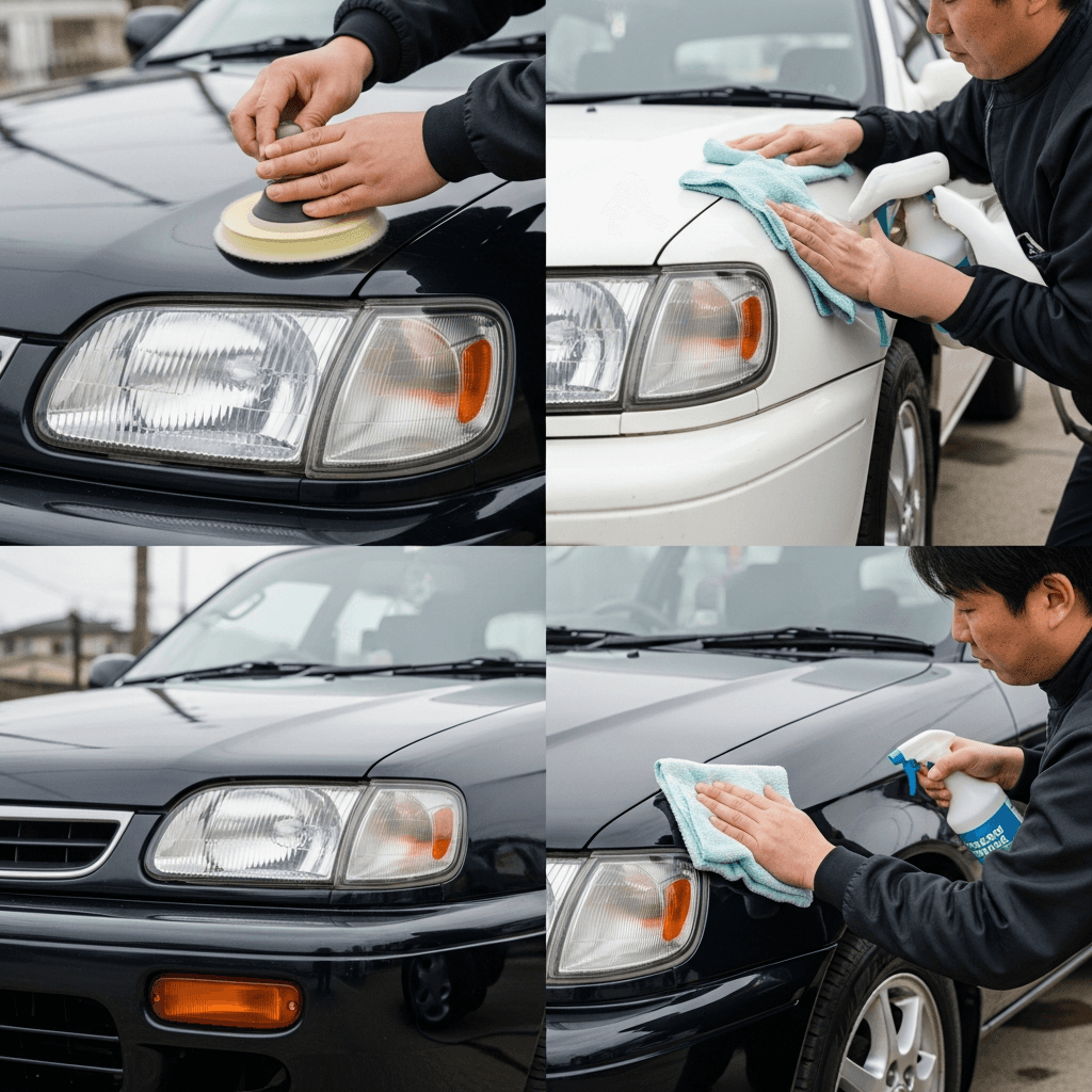 ユーノス300はヘッドライトの黄ばみとボディの鉄粉が第一印象を損ねます。研磨+鉄粉除去クリーナー+ワックスで輝きを取り戻せば「程度良好」と判断され+4~7万円の効果。