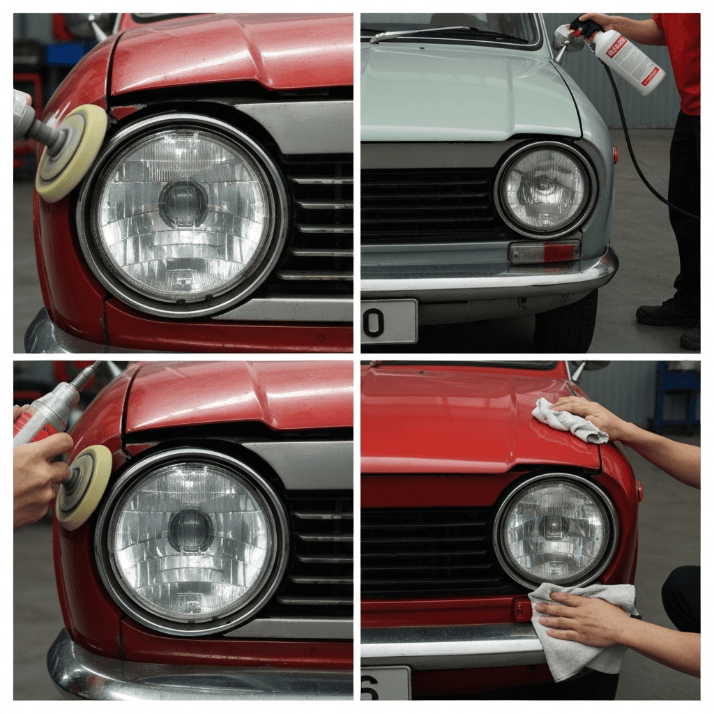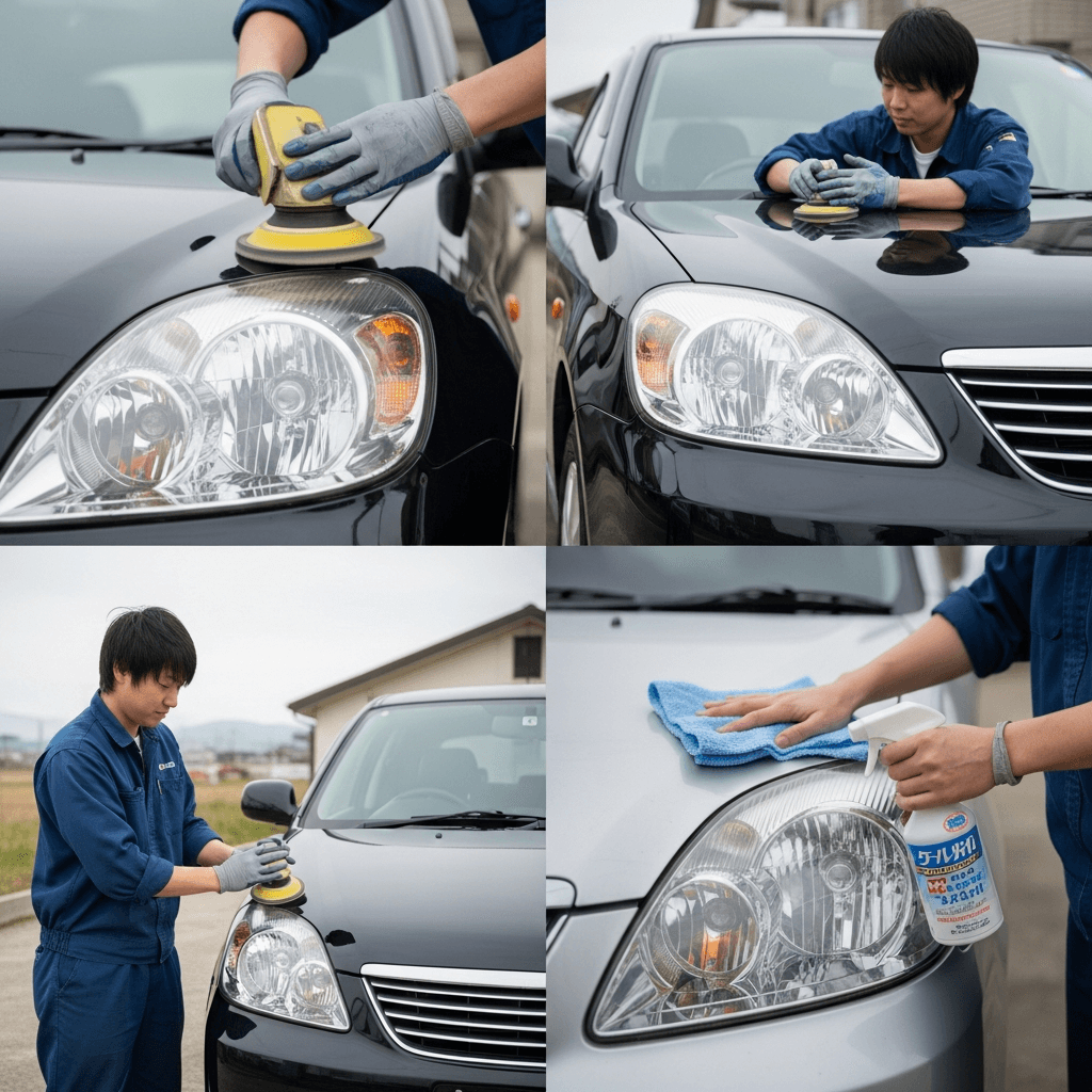 ユーノス500はヘッドライトの黄ばみとボディの鉄粉が第一印象を損ねます。研磨+鉄粉除去クリーナー+ワックスで輝きを取り戻せば「程度良好」と判断され+4~7万円の効果。