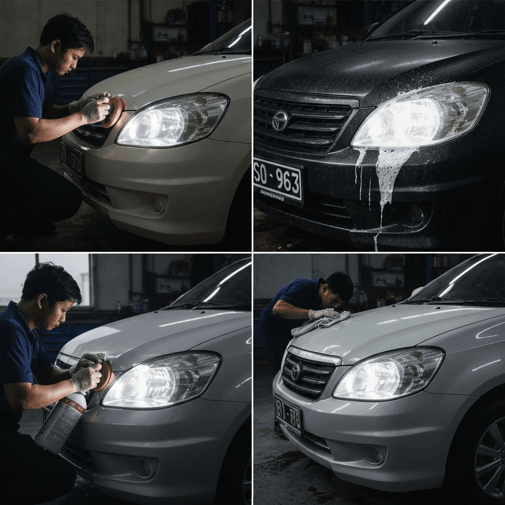 ユーノスカーゴはヘッドライトの黄ばみとボディの鉄粉が第一印象を損ねます。研磨+鉄粉除去クリーナー+ワックスで輝きを取り戻せば「程度良好」と判断され+4~7万円の効果。
