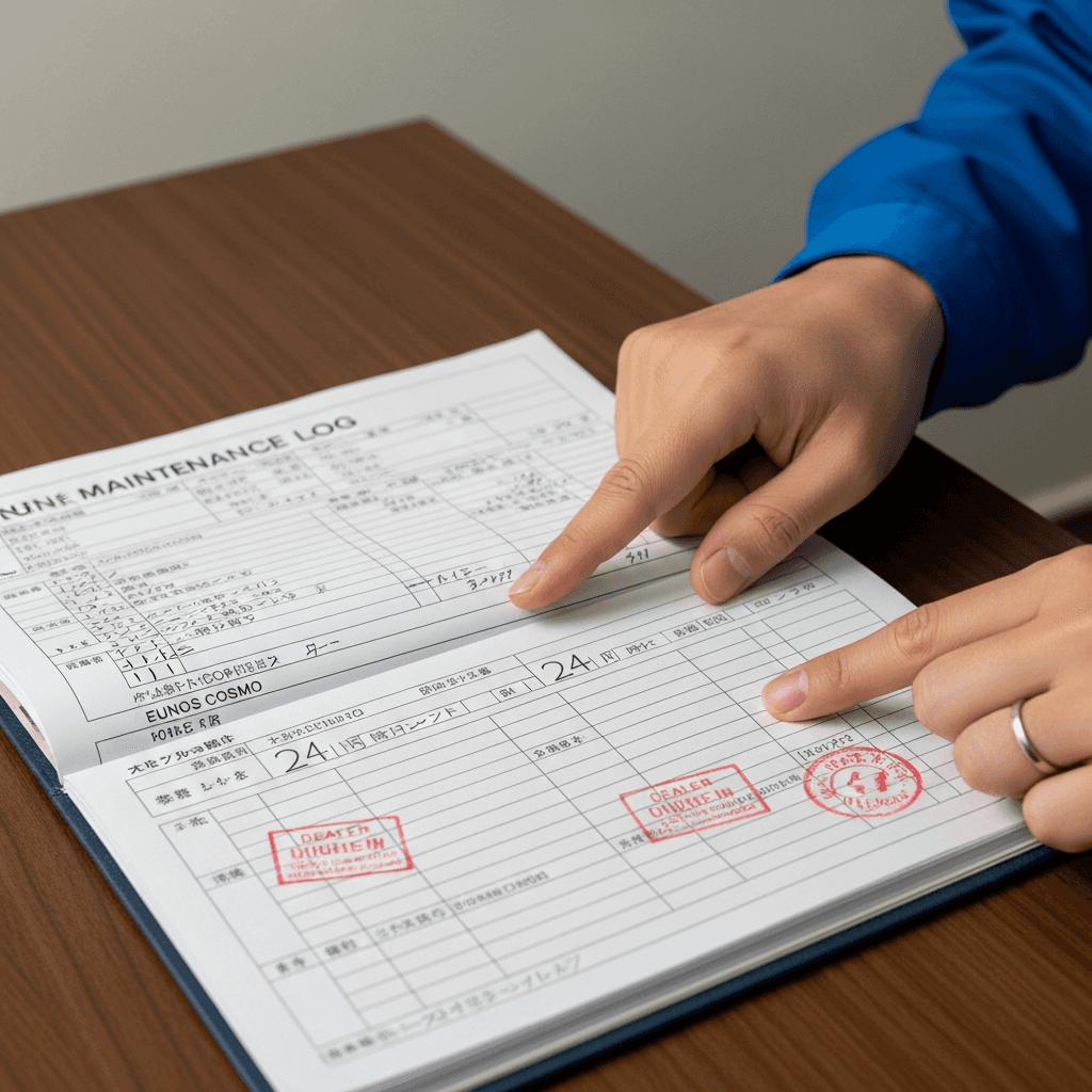 ユーノスコスモの整備記録簿に定期点検(12ヶ月・24ヶ月)の履歴が全て記載されていれば「管理の行き届いた車」と高評価。特にエンジンオイル交換履歴は重要で+6~9万円の効果。