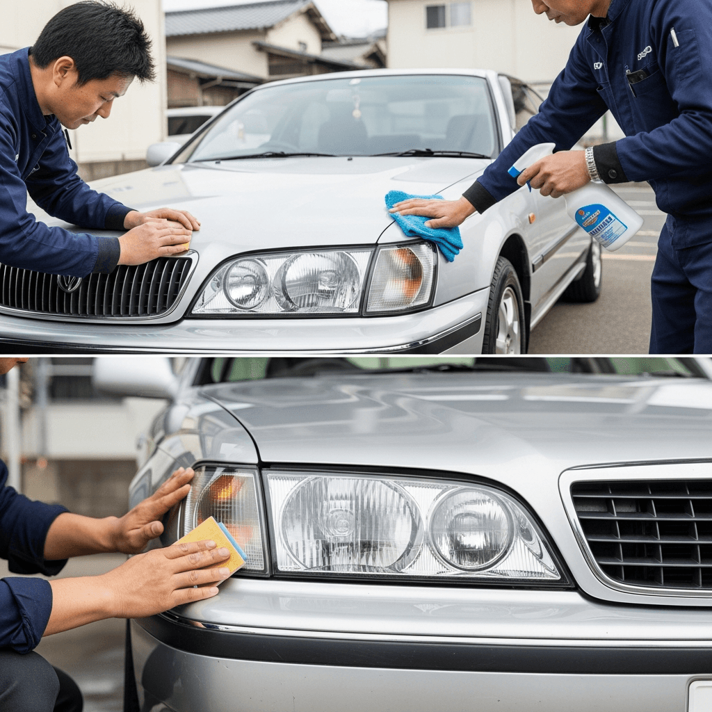 ユーノスコスモはヘッドライトの黄ばみとボディの鉄粉が第一印象を損ねます。研磨+鉄粉除去クリーナー+ワックスで輝きを取り戻せば「程度良好」と判断され+4~7万円の効果。