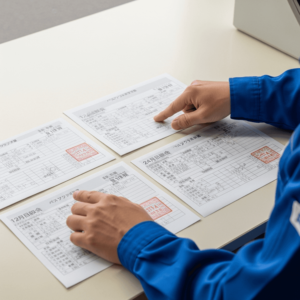 ユーノスプレッソの整備記録簿に定期点検(12ヶ月・24ヶ月)の履歴が全て記載されていれば「管理の行き届いた車」と高評価。特にエンジンオイル交換履歴は重要で+6~9万円の効果。