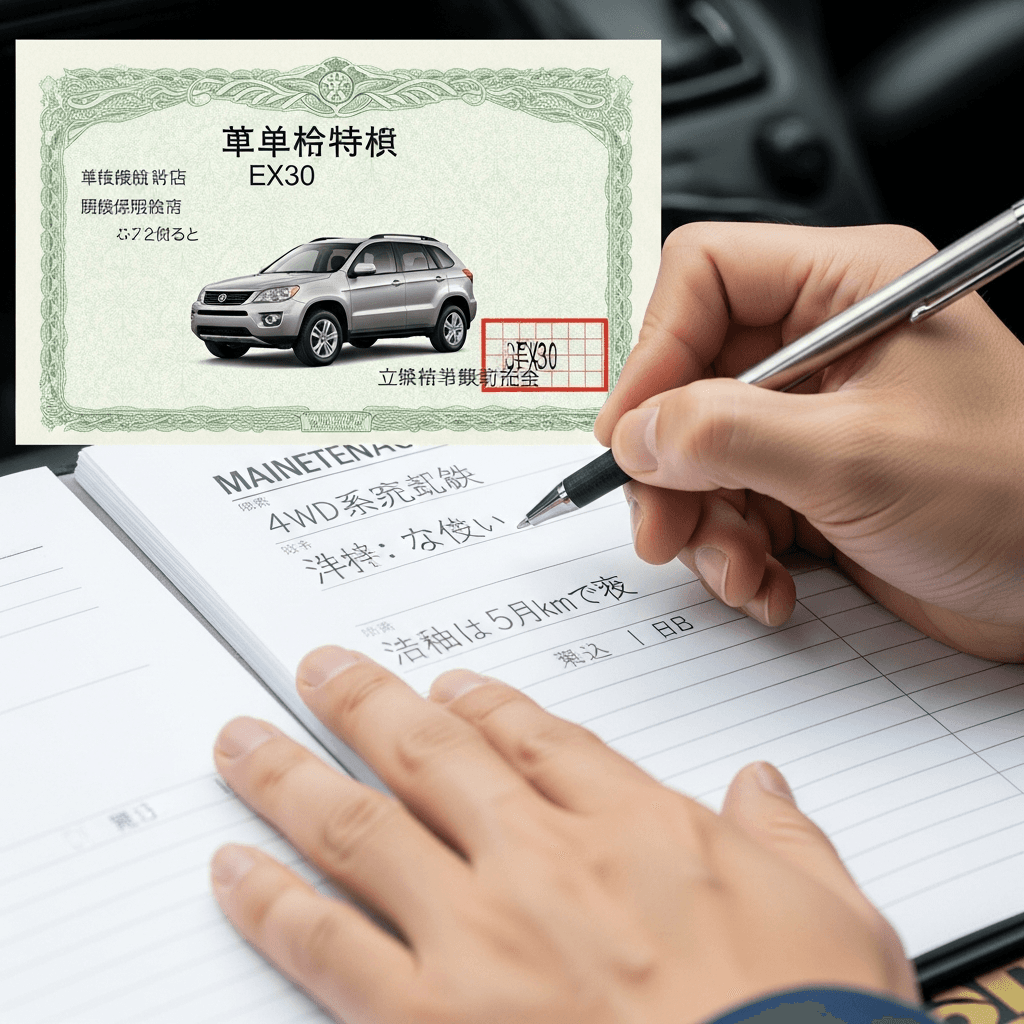 EX30のようなSUVは4WD性能が価値の源泉。4WDシステム点検とデフオイル交換記録があれば「オフロード性能維持」と高評価され、+8~12万円の査定UPが期待できます。