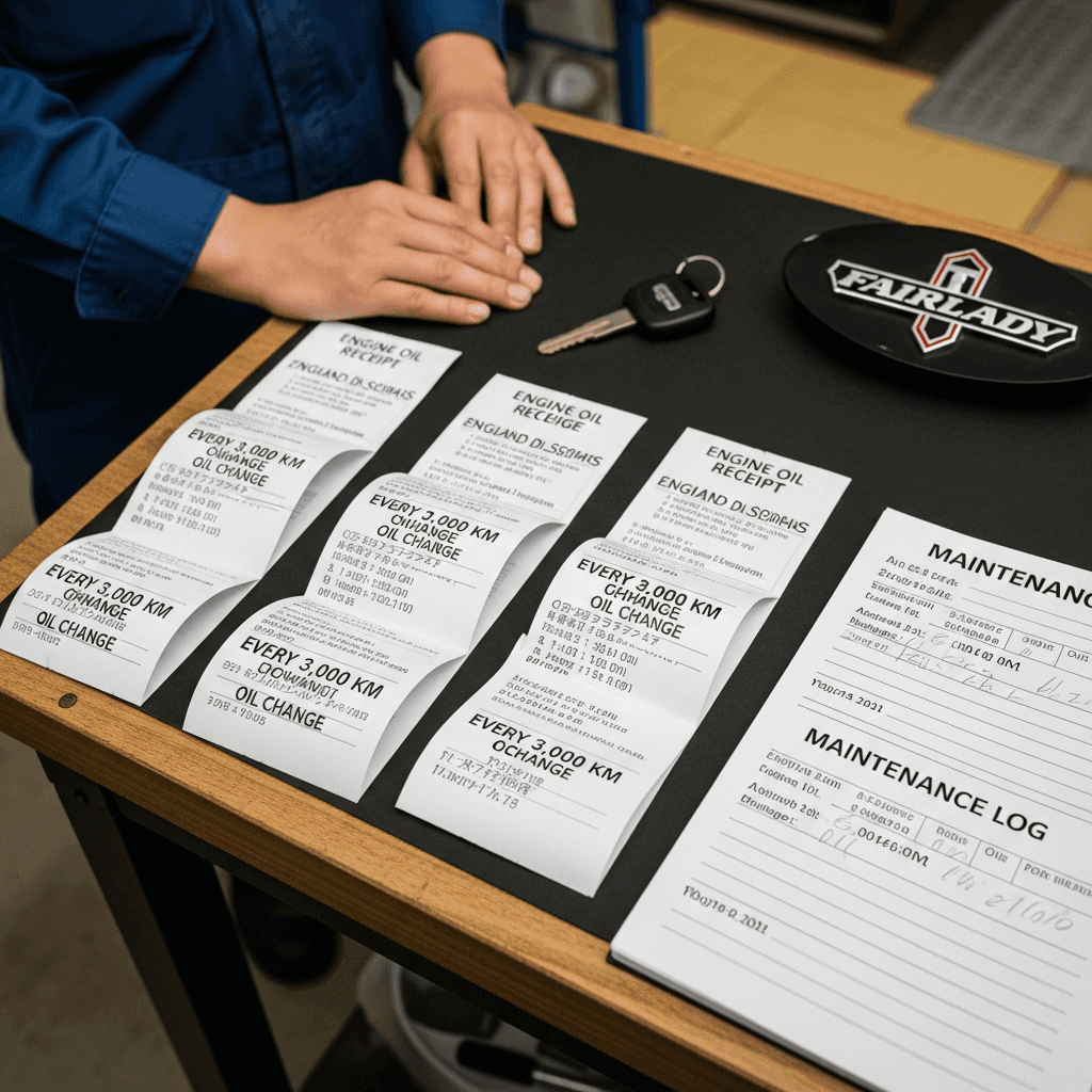 フェアレディZはスポーツ走行を前提とした車。エンジンオイル交換を3,000~5,000km毎に実施した記録(レシート+整備記録簿)があれば「エンジン管理完璧」と評価され、査定額が大幅UP。+10~15万円の効果が期待できます。