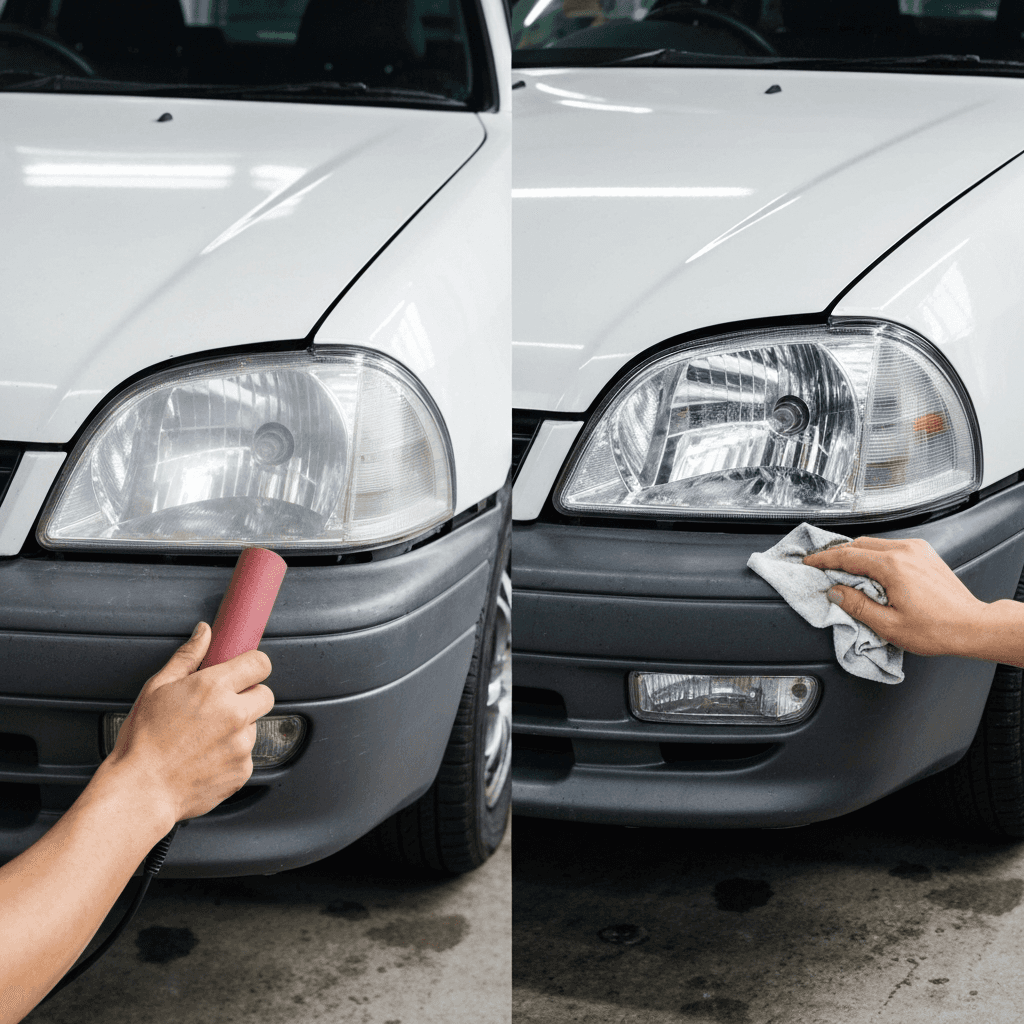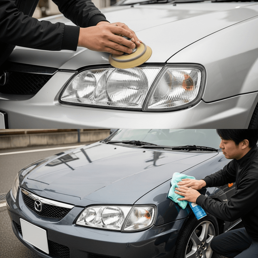 ファミリアはヘッドライトの黄ばみとボディの鉄粉が第一印象を損ねます。研磨+鉄粉除去クリーナー+ワックスで輝きを取り戻せば「程度良好」と判断され+4~7万円の効果。