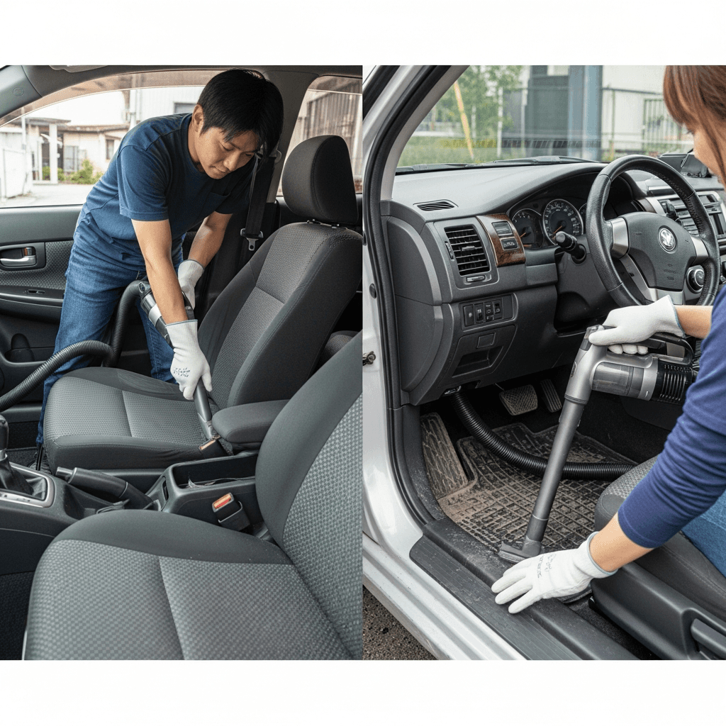 ファミリアビジネスワゴンは第一印象が査定の8割を決めます。シート隙間のゴミ除去、マット洗浄、樹脂パーツ艶出しで新車級の清潔感に。特に臭いゼロなら「禁煙車」扱いで+5~8万円UP。