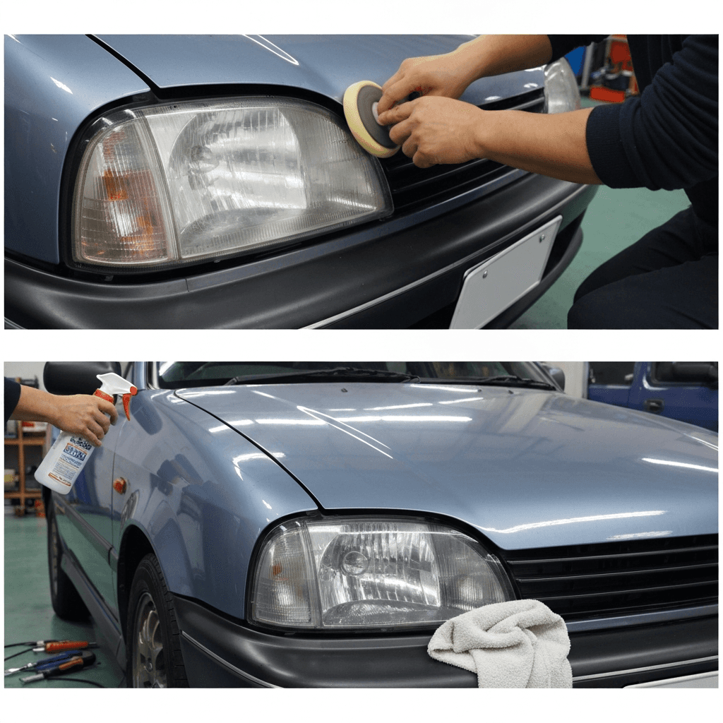 ファミリアS-ワゴンはヘッドライトの黄ばみとボディの鉄粉が第一印象を損ねます。研磨+鉄粉除去クリーナー+ワックスで輝きを取り戻せば「程度良好」と判断され+4~7万円の効果。