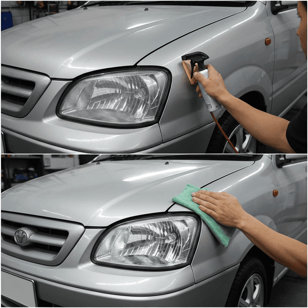 ファミリアバンはヘッドライトの黄ばみとボディの鉄粉が第一印象を損ねます。研磨+鉄粉除去クリーナー+ワックスで輝きを取り戻せば「程度良好」と判断され+4~7万円の効果。