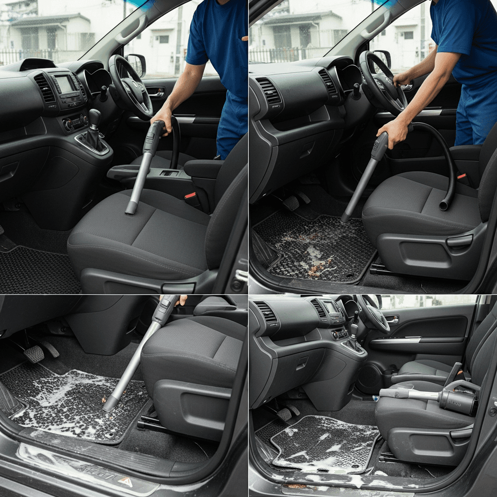 ファーゴは第一印象が査定の8割を決めます。シート隙間のゴミ除去、マット洗浄、樹脂パーツ艶出しで新車級の清潔感に。特に臭いゼロなら「禁煙車」扱いで+5~8万円UP。