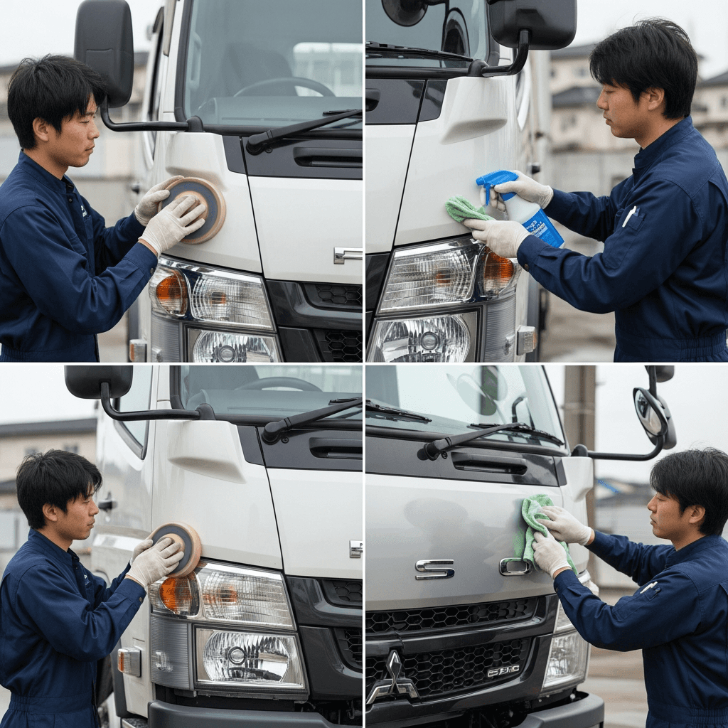 ファーゴトラックはヘッドライトの黄ばみとボディの鉄粉が第一印象を損ねます。研磨+鉄粉除去クリーナー+ワックスで輝きを取り戻せば「程度良好」と判断され+4~7万円の効果。
