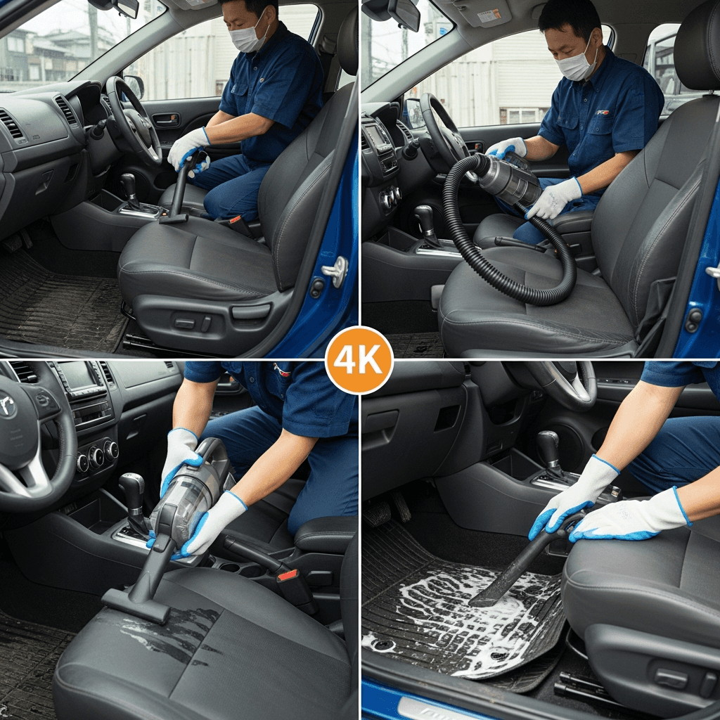 ファスターは第一印象が査定の8割を決めます。シート隙間のゴミ除去、マット洗浄、樹脂パーツ艶出しで新車級の清潔感に。特に臭いゼロなら「禁煙車」扱いで+5~8万円UP。