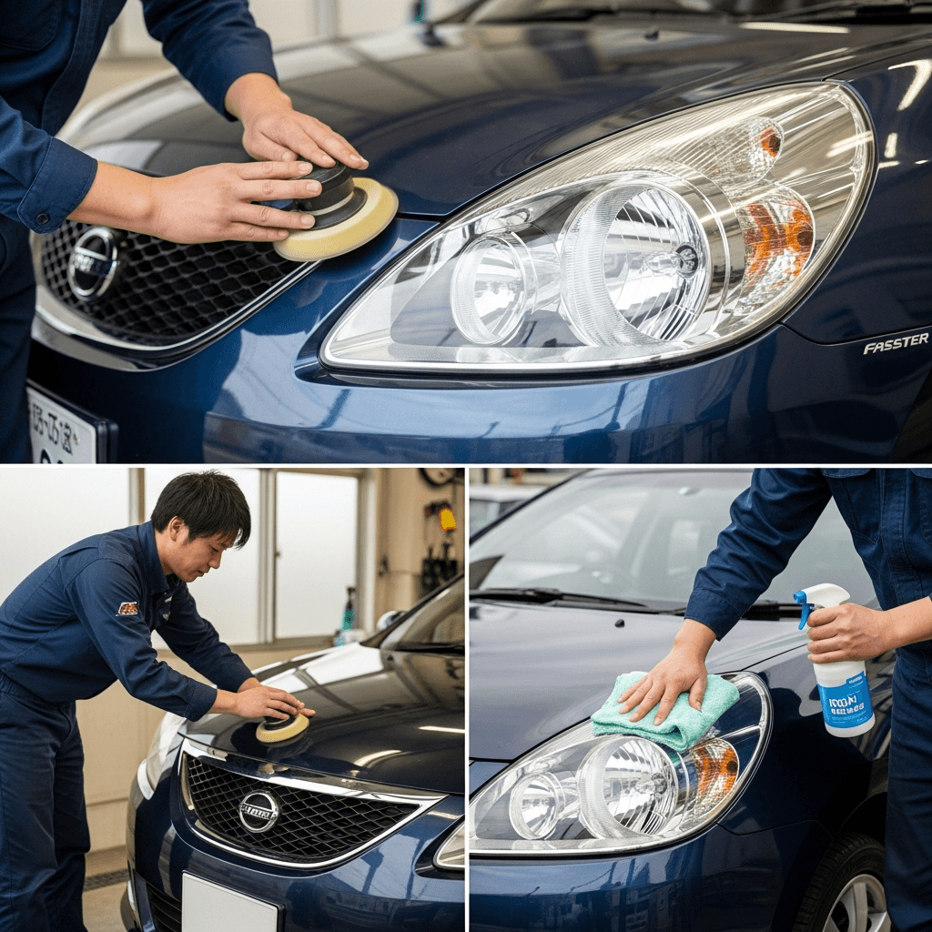 ファスターはヘッドライトの黄ばみとボディの鉄粉が第一印象を損ねます。研磨+鉄粉除去クリーナー+ワックスで輝きを取り戻せば「程度良好」と判断され+4~7万円の効果。