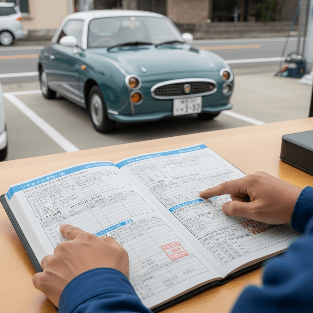 フィガロの整備記録簿に定期点検(12ヶ月・24ヶ月)の履歴が全て記載されていれば「管理の行き届いた車」と高評価。特にエンジンオイル交換履歴は重要で+6~9万円の効果。