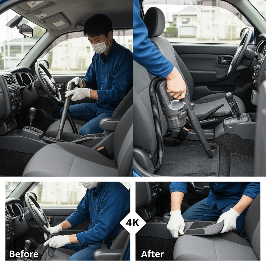 フィガロは第一印象が査定の8割を決めます。シート隙間のゴミ除去、マット洗浄、樹脂パーツ艶出しで新車級の清潔感に。特に臭いゼロなら「禁煙車」扱いで+5~8万円UP。