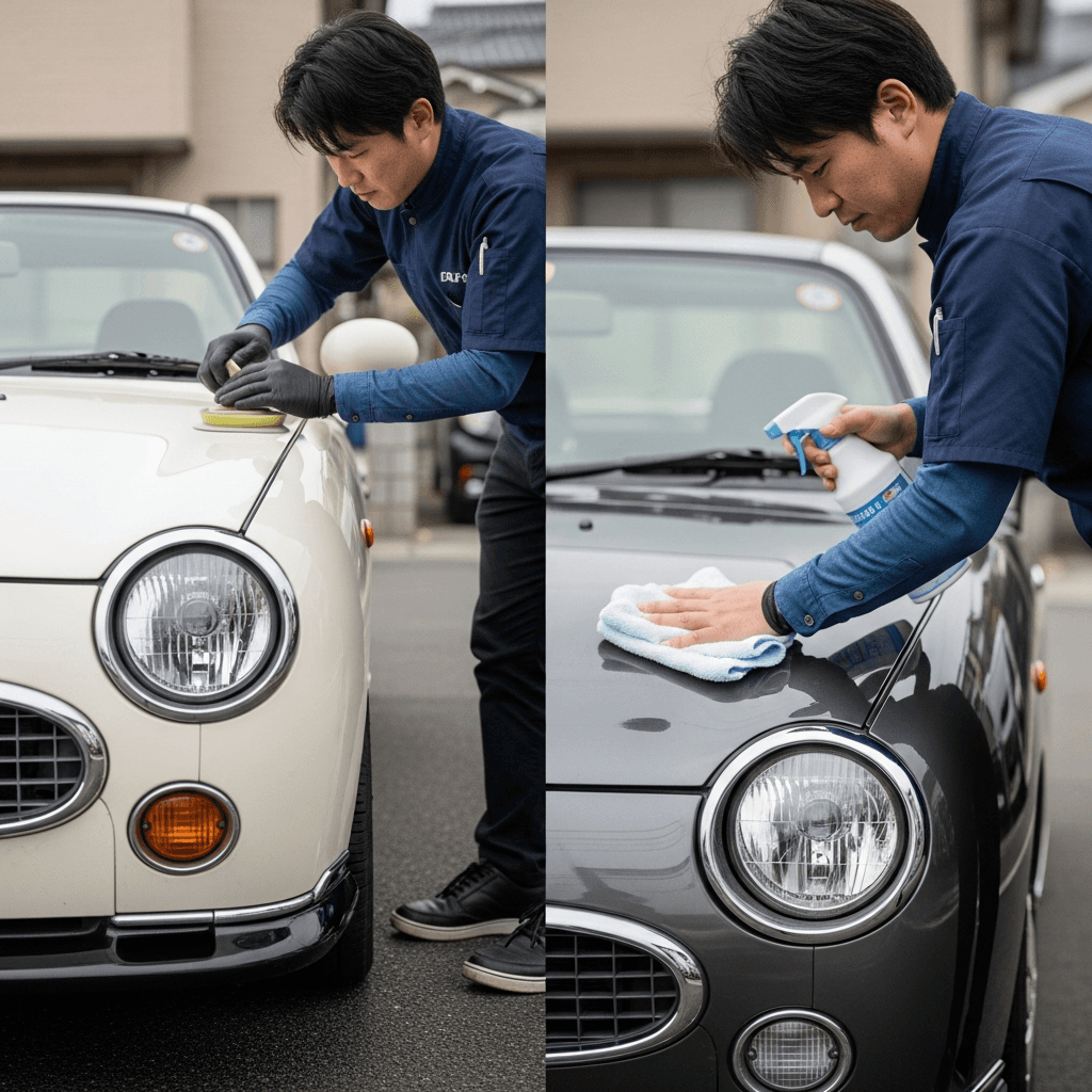 フィガロはヘッドライトの黄ばみとボディの鉄粉が第一印象を損ねます。研磨+鉄粉除去クリーナー+ワックスで輝きを取り戻せば「程度良好」と判断され+4~7万円の効果。