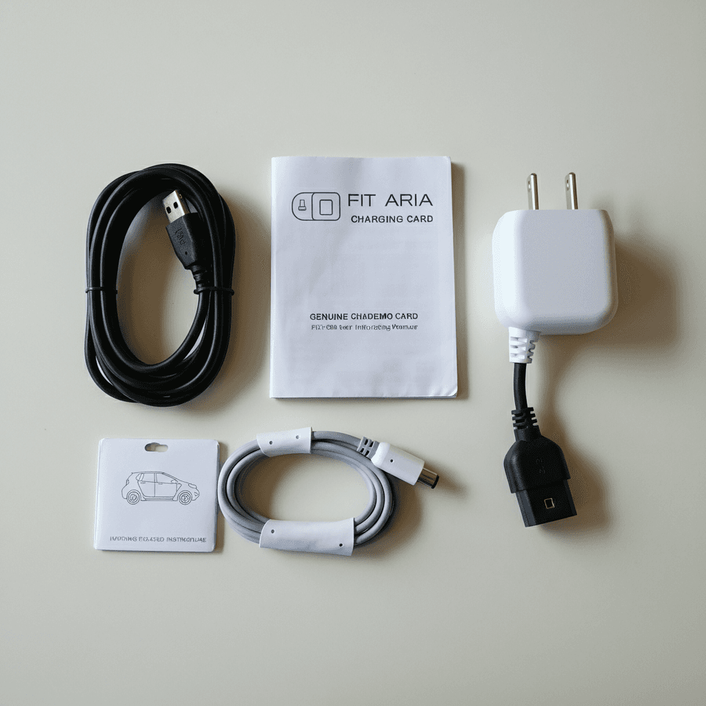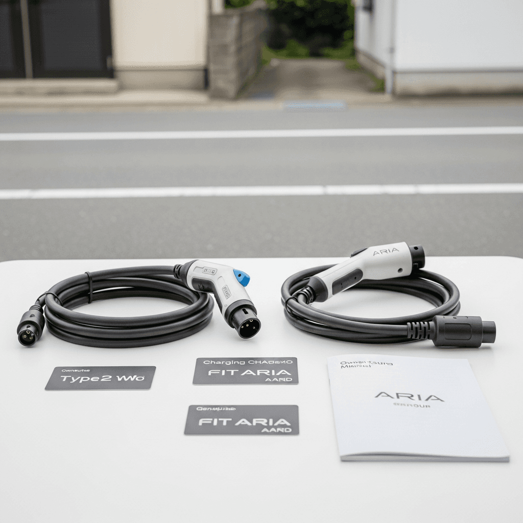 EV車の査定は充電環境が全て。フィットアリアの純正充電ケーブル(普通・急速)、充電カード(会員証)、アダプター類を全て揃えて撮影。「すぐ使える」安心感で+6~10万円UPが期待できます。