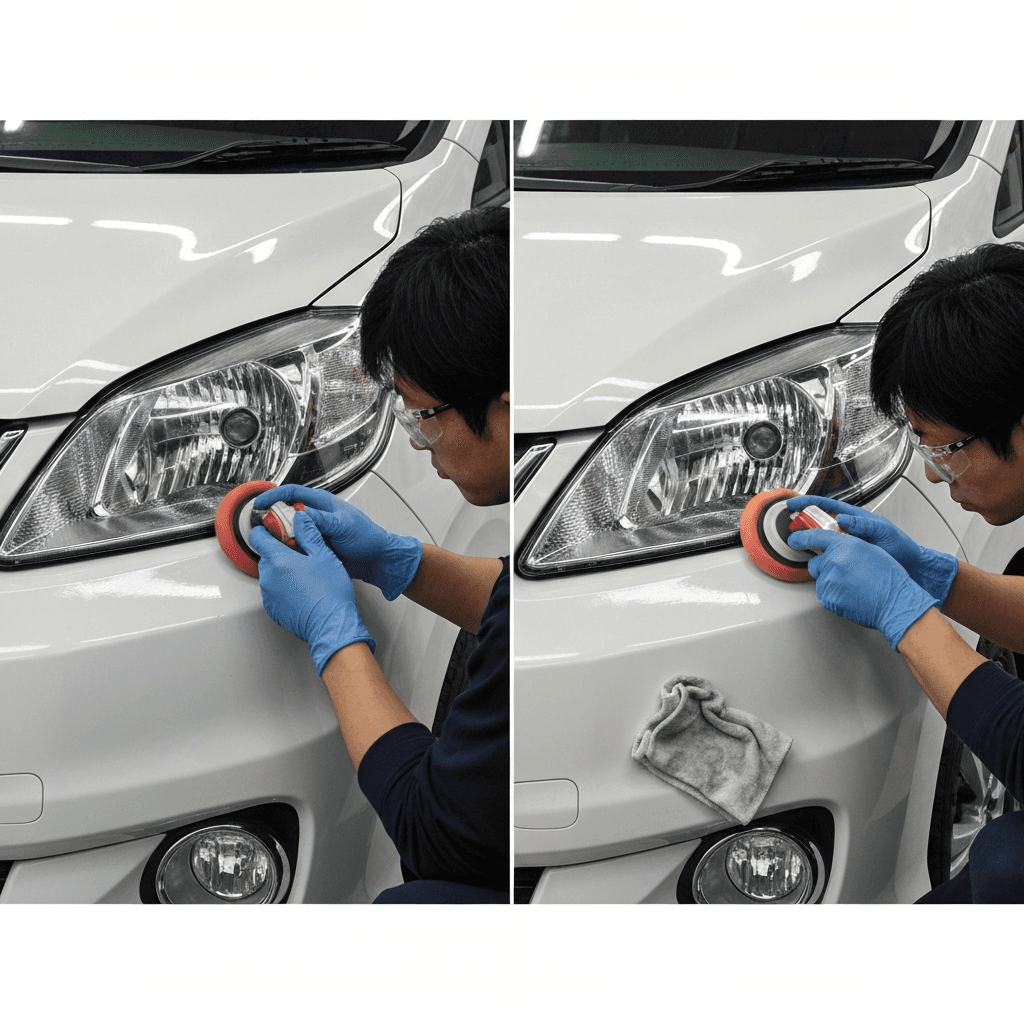 フリードはヘッドライトの黄ばみとボディの鉄粉が第一印象を損ねます。研磨+鉄粉除去クリーナー+ワックスで輝きを取り戻せば「程度良好」と判断され+4~7万円の効果。
