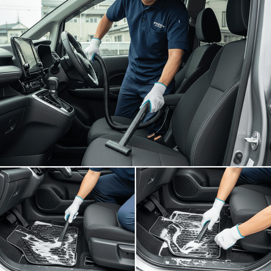 フリード+は第一印象が査定の8割を決めます。シート隙間のゴミ除去、マット洗浄、樹脂パーツ艶出しで新車級の清潔感に。特に臭いゼロなら「禁煙車」扱いで+5~8万円UP。
