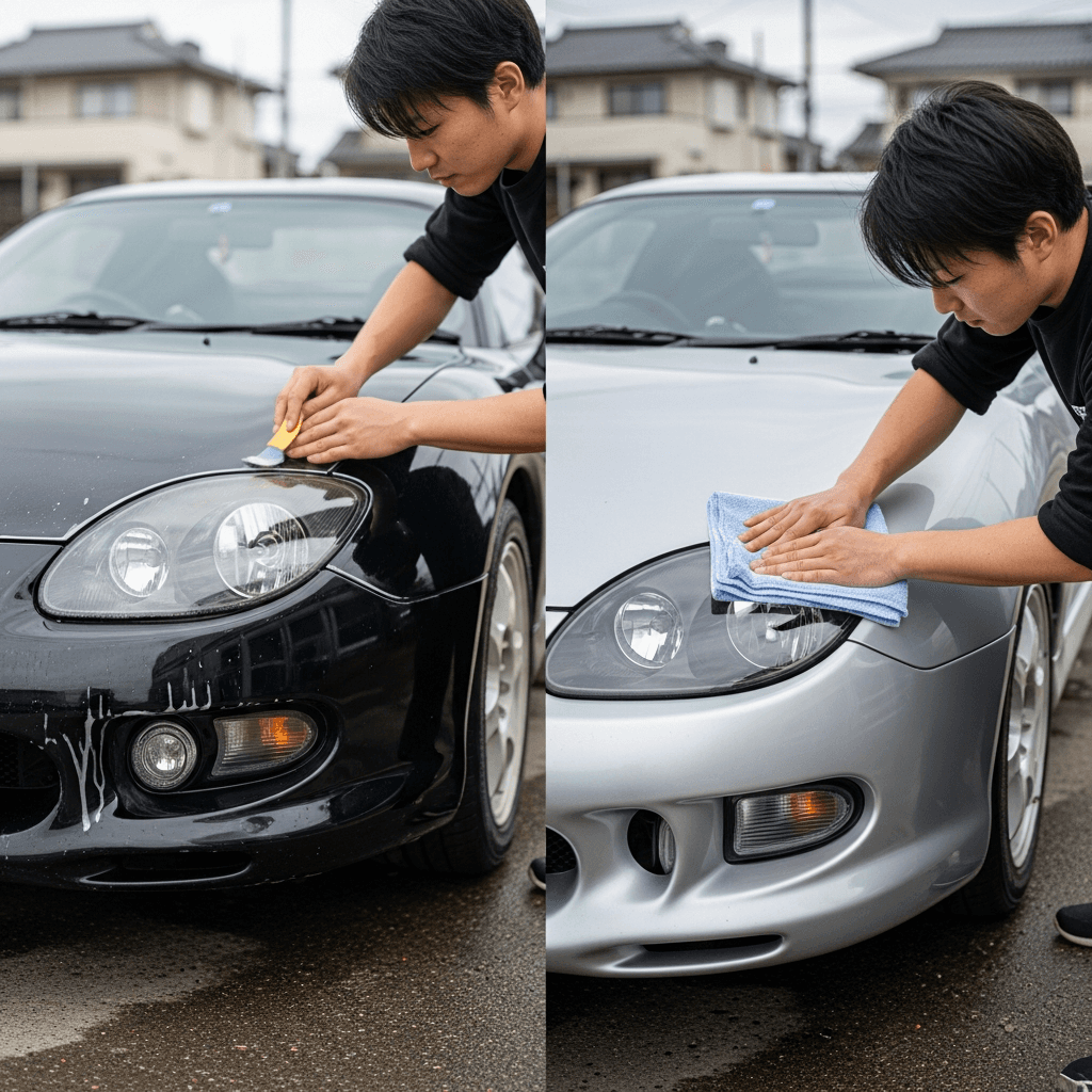FTOはヘッドライトの黄ばみとボディの鉄粉が第一印象を損ねます。研磨+鉄粉除去クリーナー+ワックスで輝きを取り戻せば「程度良好」と判断され+4~7万円の効果。