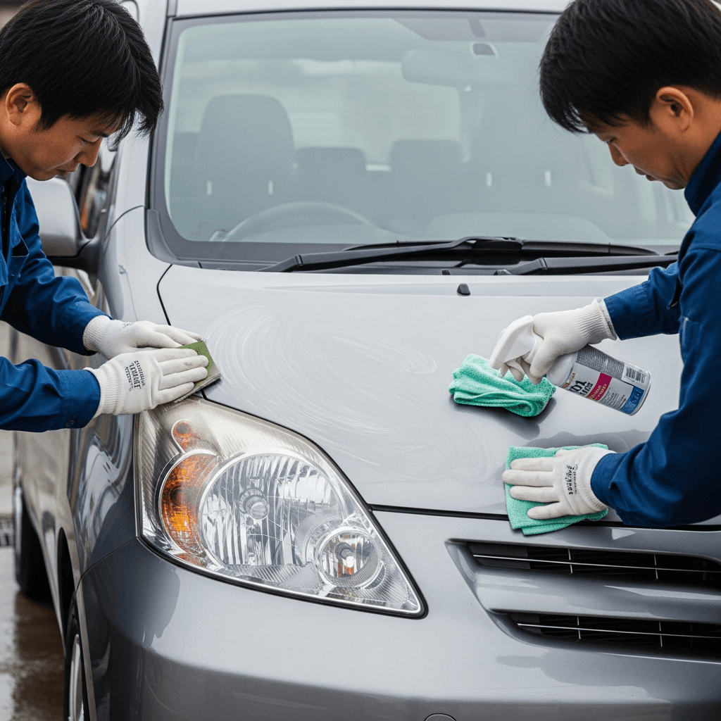 ファンカーゴはヘッドライトの黄ばみとボディの鉄粉が第一印象を損ねます。研磨+鉄粉除去クリーナー+ワックスで輝きを取り戻せば「程度良好」と判断され+4~7万円の効果。