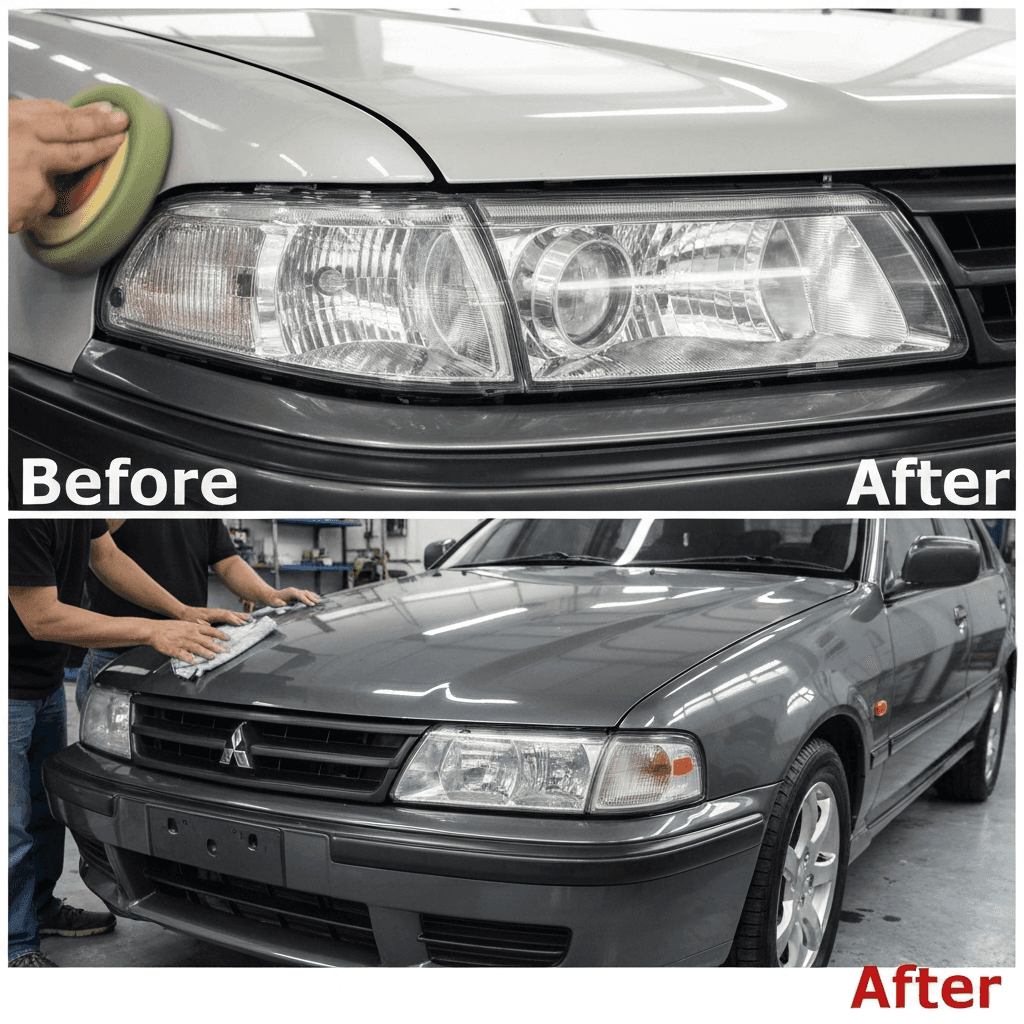 ギャランフォルティスはヘッドライトの黄ばみとボディの鉄粉が第一印象を損ねます。研磨+鉄粉除去クリーナー+ワックスで輝きを取り戻せば「程度良好」と判断され+4~7万円の効果。