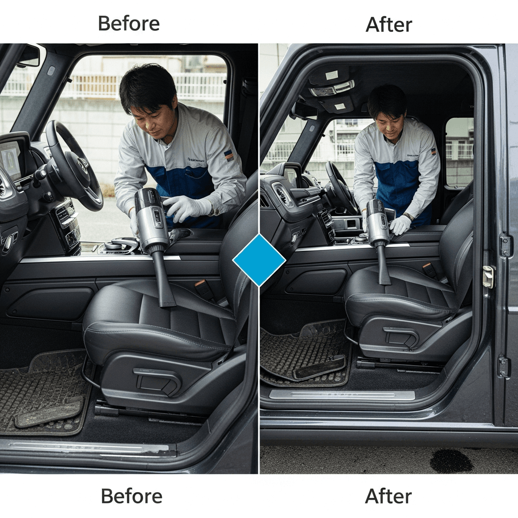 ゲレンデヴァーゲンは第一印象が査定の8割を決めます。シート隙間のゴミ除去、マット洗浄、樹脂パーツ艶出しで新車級の清潔感に。特に臭いゼロなら「禁煙車」扱いで+5~8万円UP。