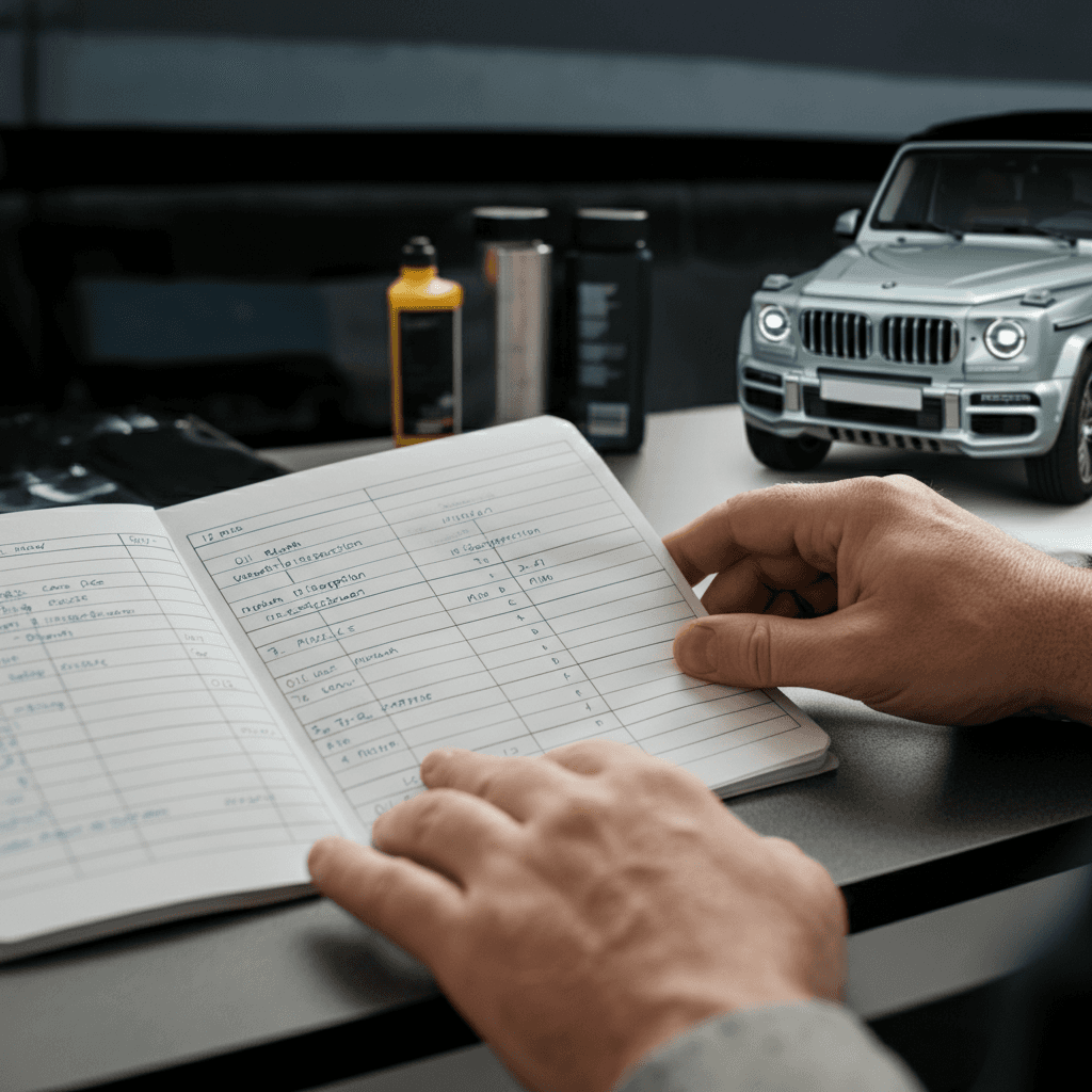 ゲレンデヴァーゲンの整備記録簿に定期点検(12ヶ月・24ヶ月)の履歴が全て記載されていれば「管理の行き届いた車」と高評価。特にエンジンオイル交換履歴は重要で+6~9万円の効果。