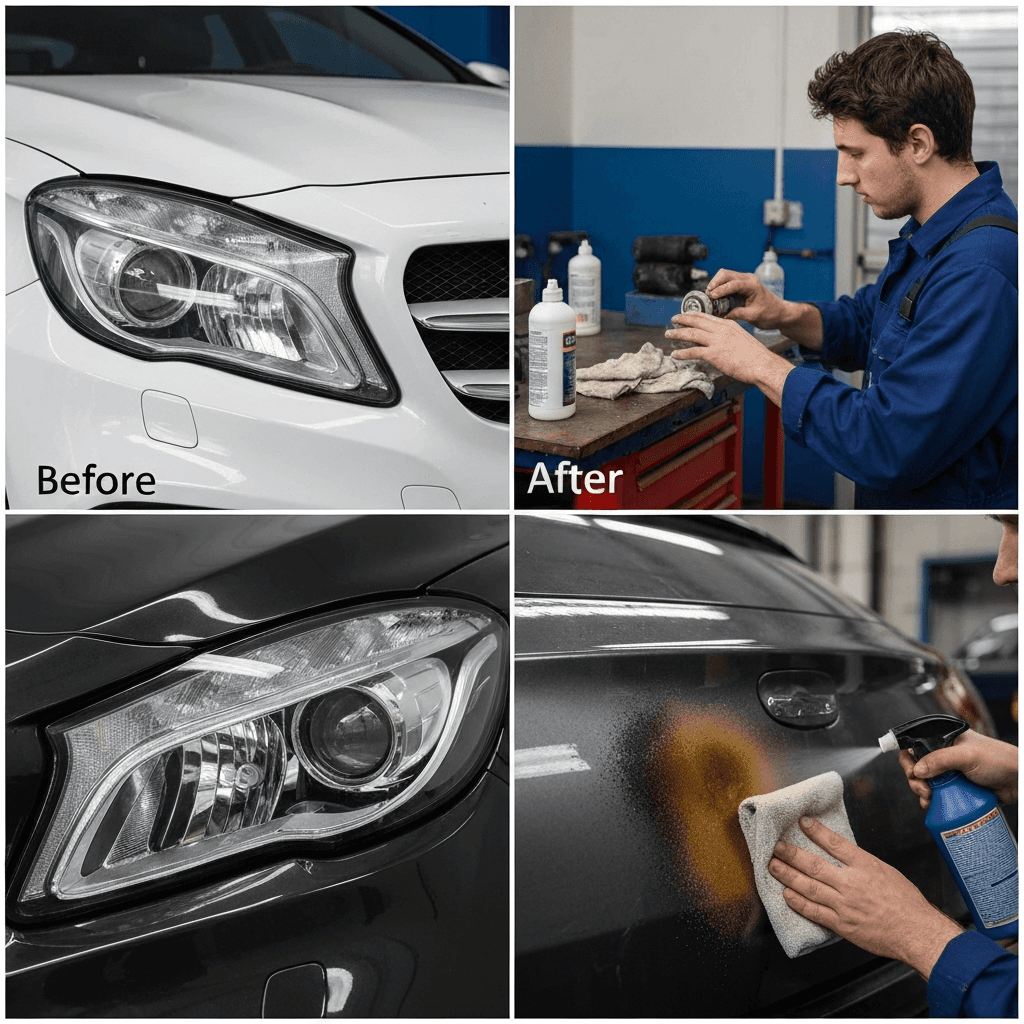GLAクラスはヘッドライトの黄ばみとボディの鉄粉が第一印象を損ねます。研磨+鉄粉除去クリーナー+ワックスで輝きを取り戻せば「程度良好」と判断され+4~7万円の効果。