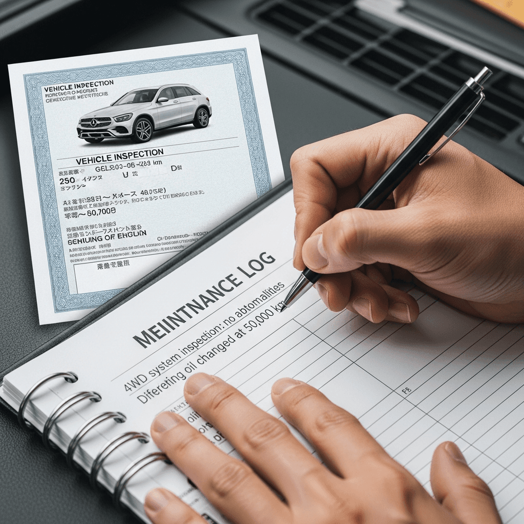GLCのようなSUVは4WD性能が価値の源泉。4WDシステム点検とデフオイル交換記録があれば「オフロード性能維持」と高評価され、+8~12万円の査定UPが期待できます。
