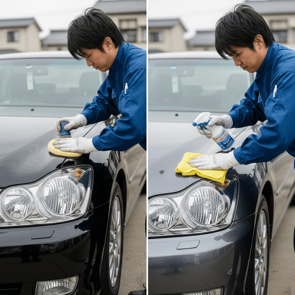グロリアセダンはヘッドライトの黄ばみとボディの鉄粉が第一印象を損ねます。研磨+鉄粉除去クリーナー+ワックスで輝きを取り戻せば「程度良好」と判断され+4~7万円の効果。