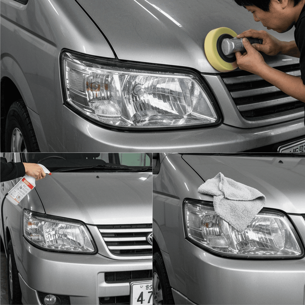 グロリアバンはヘッドライトの黄ばみとボディの鉄粉が第一印象を損ねます。研磨+鉄粉除去クリーナー+ワックスで輝きを取り戻せば「程度良好」と判断され+4~7万円の効果。