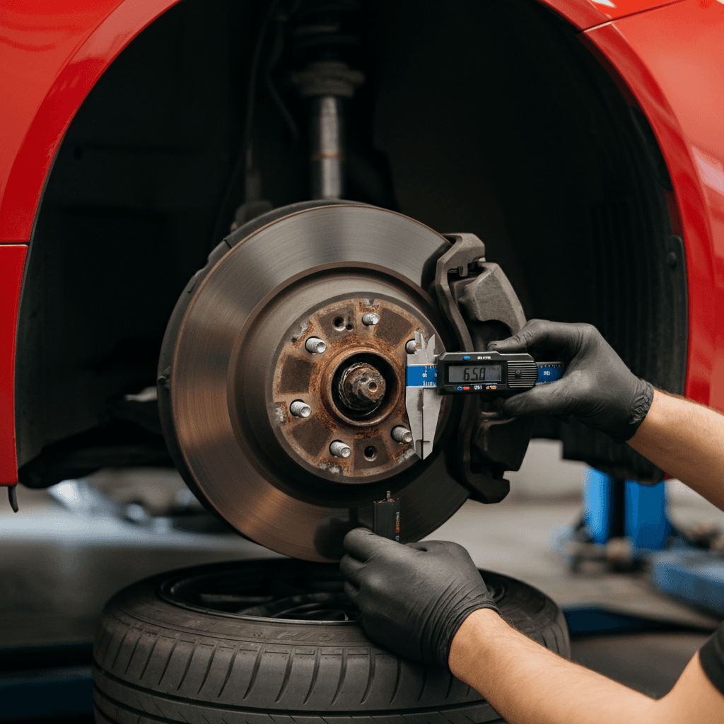 スポーツカーはブレーキとタイヤが査定の最重要項目。パッド残量6mm以上、タイヤ溝5mm以上を写真+ノギス測定値で証明すれば、「走行性能良好」の安心感を与え+8~12万円の評価UP。