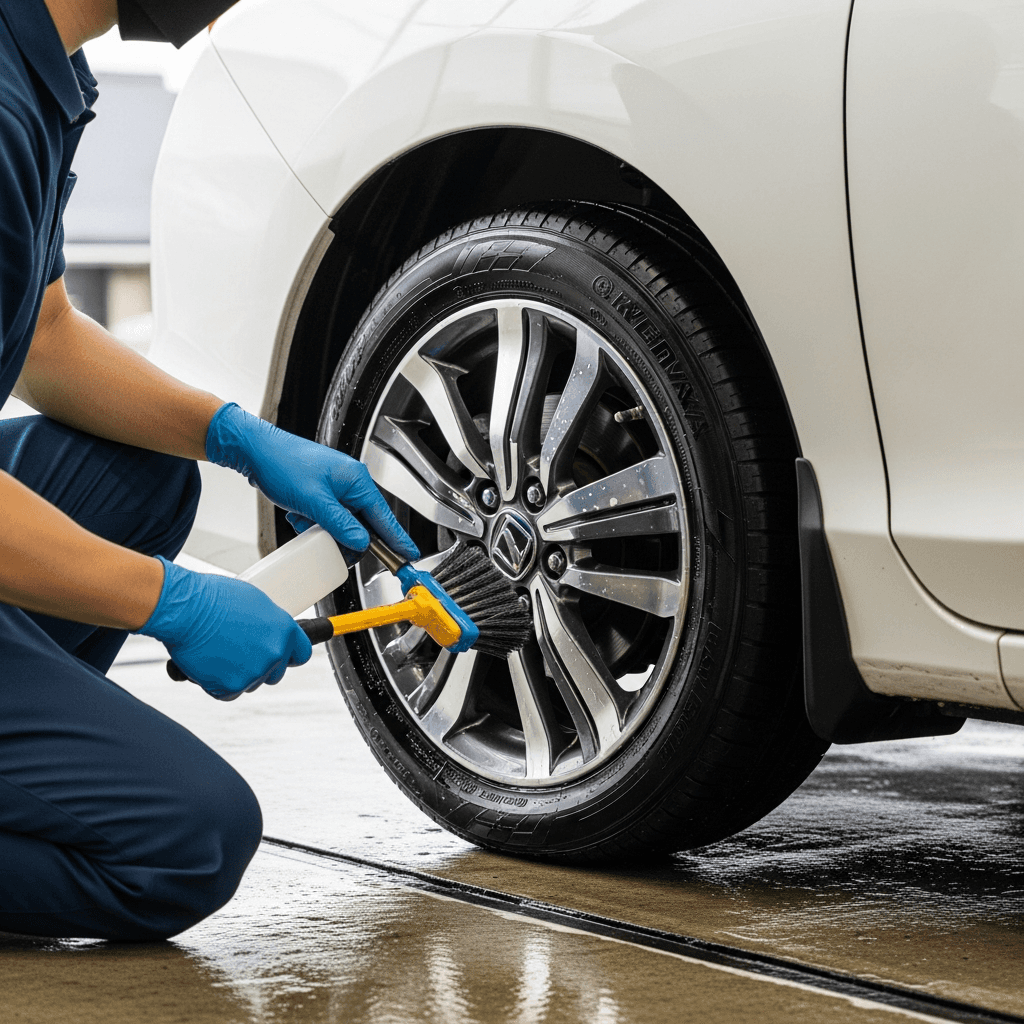 セダンは純正アルミホイールの傷が目立ちやすい。ホイールクリーナーで洗浄+タイヤ溝5mm以上確保で「足回り良好」評価。特にグレイスは高級感が重要で+6~9万円の効果。