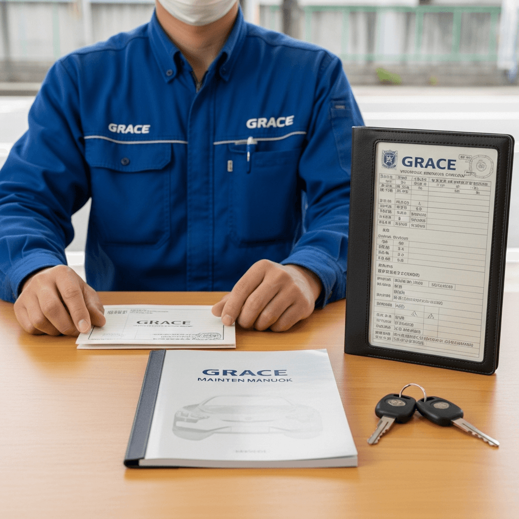 グレイスは高級セダンとして書類完備が必須。整備記録簿、取扱説明書、スペアキー2本が揃っていれば「ワンオーナー級の管理」で+4~7万円UP。特にスペアキーは重要。