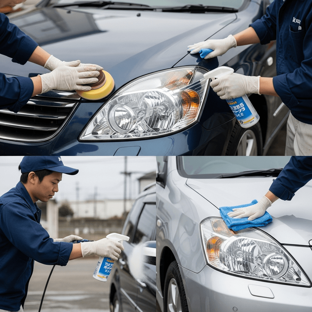 グランディスはヘッドライトの黄ばみとボディの鉄粉が第一印象を損ねます。研磨+鉄粉除去クリーナー+ワックスで輝きを取り戻せば「程度良好」と判断され+4~7万円の効果。