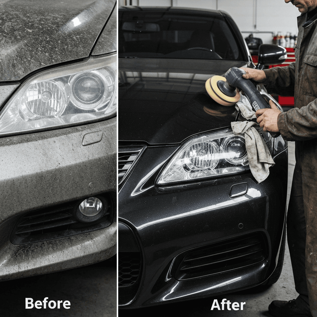 GS Fはヘッドライトの黄ばみとボディの鉄粉が第一印象を損ねます。研磨+鉄粉除去クリーナー+ワックスで輝きを取り戻せば「程度良好」と判断され+4~7万円の効果。