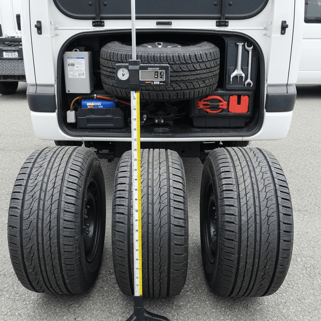 商用車はタイヤが消耗品。4本新品(または溝8mm以上)+スペアタイヤ完備なら「すぐ業務使用可能」で+4~7万円UP。特にハイエースバンは配送業需要が高く効果大。