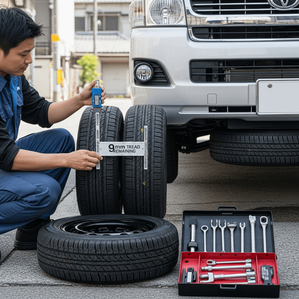 商用車はタイヤが消耗品。4本新品(または溝8mm以上)+スペアタイヤ完備なら「すぐ業務使用可能」で+4~7万円UP。特にハイエースワゴンは配送業需要が高く効果大。